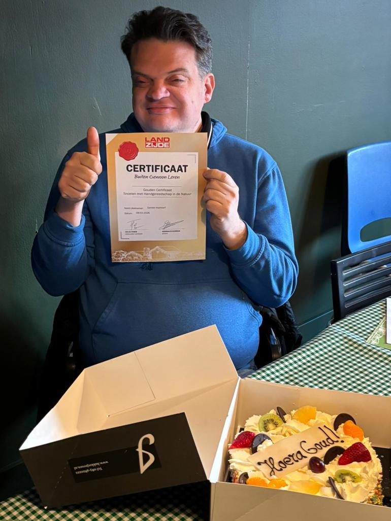 Op zorgboerderij De Meent stond Sander trots met zijn 50e certificaat in zijn handen. Op tafel stond een lekkere taart die hij van Landzijde had gekregen speciaal voor hem.
