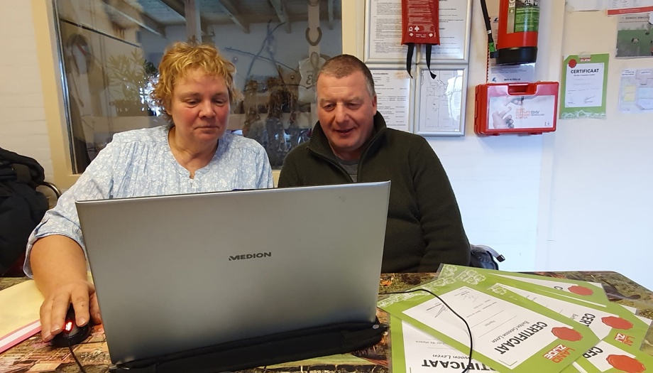 De sfeer op de zorgboerderij speelt ook een goede rol in de samenwerking. Gerrit: ”Ik zeg wel eens tegen anderen, komen is blijven!” Marion: “De eerste keer zei hij tegen mij als je komt, dan blijf je. De sfeer is heel goed.” De uitdaging voor beiden is het behalen van het certificaat, maar door elkaar te stimuleren en aan te vullen komen ze er altijd uit. Marion print alle leerstof uit, zodat ze beiden de stof kunnen lezen vanuit huis. Wanneer ze moeilijke woorden tegenkomen, wordt het opgezocht op het internet of in het woordenboek.
